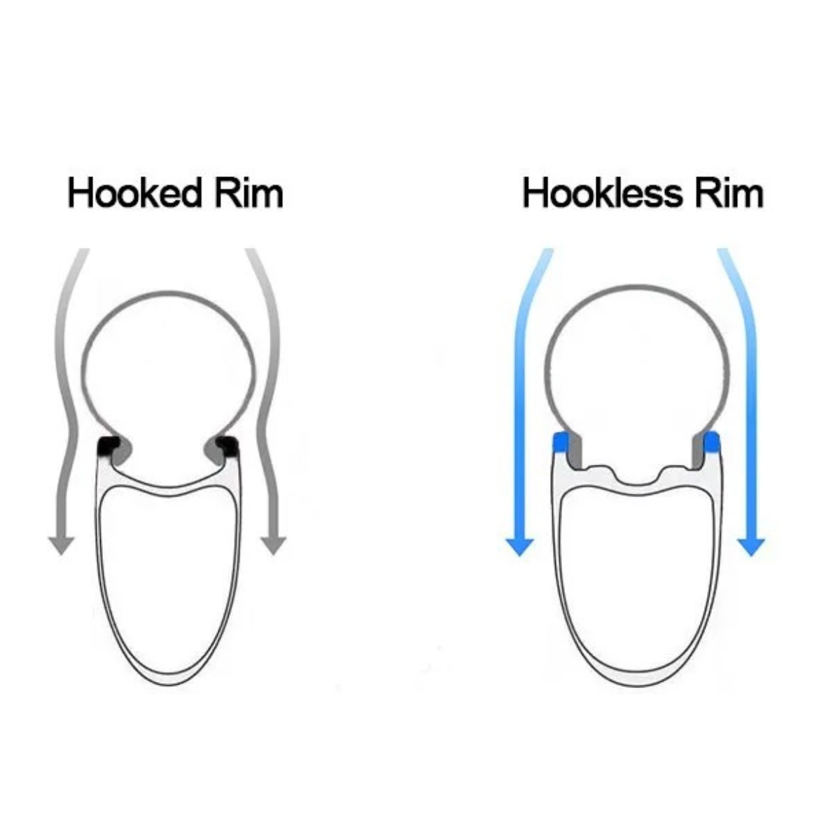 Na schemacie porównującym oba rozwiązania widać, że obręcze hookless z oponami mogą oferować lepszy opływ powietrza niż klasyczne obręcze hooked.